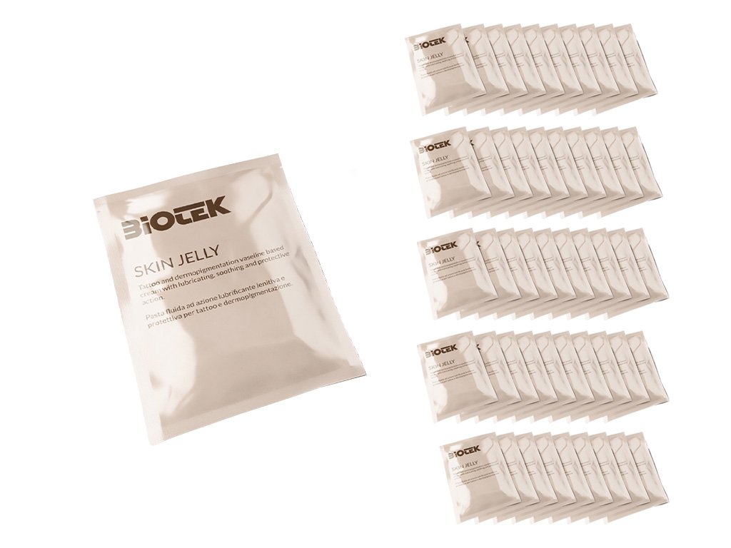 Řada následné péče BIOTEK je specifická pro dermopigmentační proceduru a následnou péči. Skin Jelly je hladká pasta, zklidňující a ochranná, která se aplikuje na ošetřovanou oblast. Jeho vysoká hydratační síla snižuje tvorbu strupů během fáze hojení. Malé a praktické sáčky Skin Jelly jsou perfektní domácí pomůckou pro následnou péči, kterou můžete dát své klientce po ošetření.