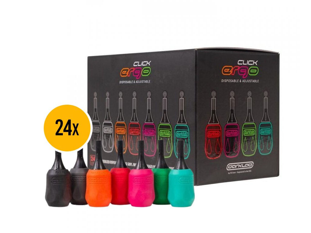 Jednorázový grip Click Ergo byl designován s důrazem na ergonomii a obsahuje systém Ratchet Disc. Tento systém umožňuje nastavení hloubky jehly pouhým otočením gripu až 4mm. Jakmile je hloubka jehly nastavena, systém nastavitelného gripu zabraňuje jeho otočení i při použití těžkých tetovacích strojků. Průměr Click Ergo gripu je od 25 - 32mm pro optimální komfort pro každou ruku. Také díky konstrukci umožňuje tatérovi dostat se blízko ke cartridgi pro maximání přesnost a kontrolu při zachování standardní malovací pozice. Ergonomie gripu také snižuje únavu ruky. 3 mm centrální otvor je kompatibilní se všemi tetovacími strojky s vestavěným táhlem. Klíčové vlastnosti: různé barevné provedení, sterilně balené nastavitelná hloubka jehly: 0 - 4 mm průměr: 32 mm v nejširším bodě ergonomický design made in USA