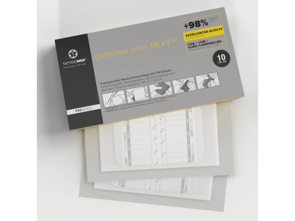 S nově revidovanou náplastí TattooMed Protection milky nejen chráníte svou pokožku po tetování před kontaminací, suchostí a choroboplodnými zárodky, ale mléčná náplast slouží také jako spolehlivá UV ochrana a nepropouští žádné škodlivé záření. Také optimálně podporuje péči a je voděodolná a prodyšná.