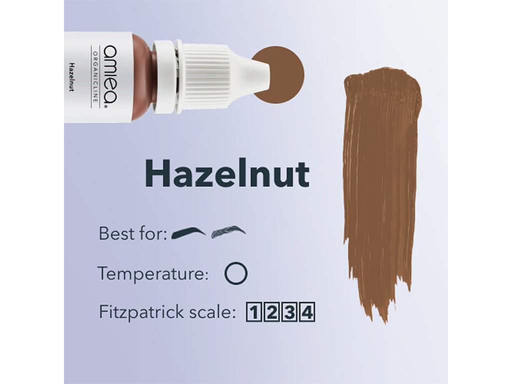 Amiea - Hazelnut předvádí středně tmavě hnědý odstín, pečlivě formulovaný tak, aby byl všestranným nástrojem pro vytváření realistických tahů vlasů a jemného stínování. Jeho přizpůsobivost při dosahování dokonalé rovnováhy a naturalizující barvy obočí z něj činí nepostradatelnou volbu pro umělce PMU.