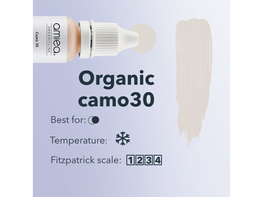 Amiea - Organic Camo 30 představuje chladnou maskovací barvu, pečlivě formulovanou tak, aby sloužila jako základní nástroj při skrývání teplých barev. Jeho účinnost při poskytování dokonalého krytu pro teplé tóny umožňuje umělcům PMU dosáhnout harmonického a vyváženého vzhledu.