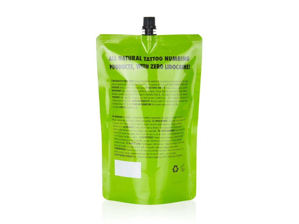 Používejte ho jako každé zelené mýdlo k čištění přebytečného inkoustu při tetování s dalšími výhodami znecitlivění oblasti a dramatického snížení otoku a zarudnutí.