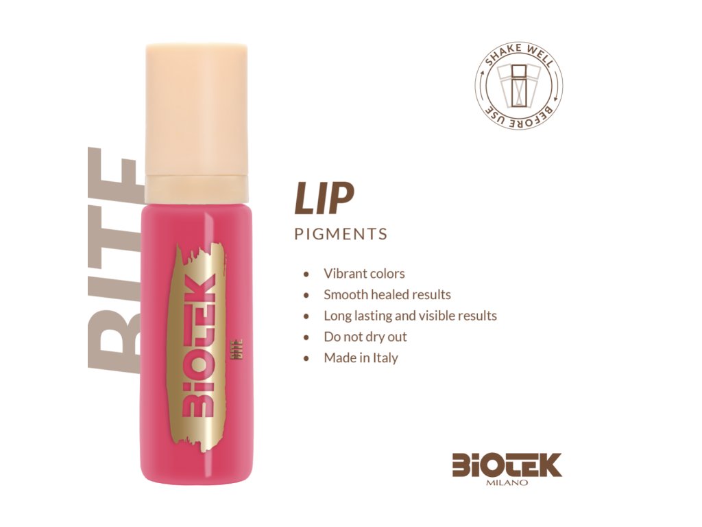 Pigment Biotek Bite 15ml je navržen pro techniky permanentního make-upu rtů a microblading s cílem vytvořit výrazný, ale rovnoměrný růžový efekt. Obsahuje specifickou kombinaci pigmentů, která umožňuje plné krytí a stabilní výsledek bez nežádoucích barevných posunů po zahojení. Výroba probíhá v Itálii, pigment je veganský, netestovaný na zvířatech a vyhovuje příslušným evropským nařízením pro PMU. Tekutější krémová textura usnadňuje implantaci barvy a aplikaci i ve výkonných profesionálních studiích.
