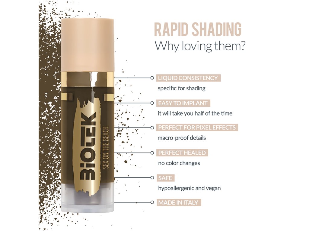 Tekuté a snadno implantovatelné pigmenty Rapid Shading skutečně mění hru v tomto odvětví. Okamžitě se vsakují do pokožky a zůstávají velmi viditelné i po procesu hojení.
