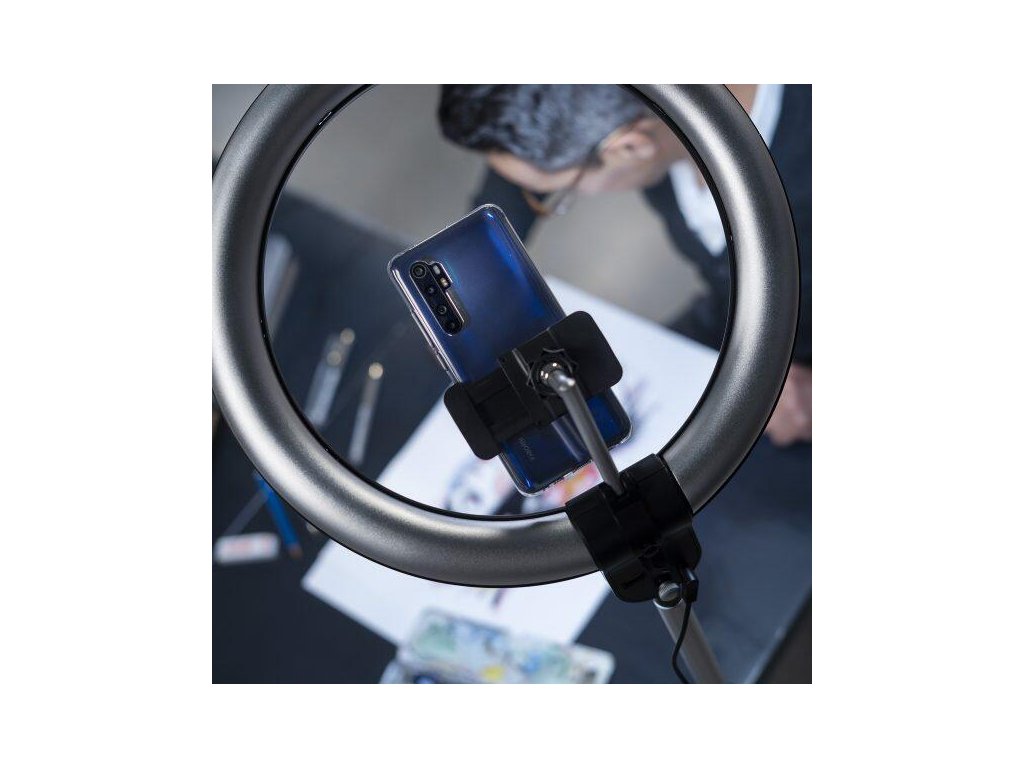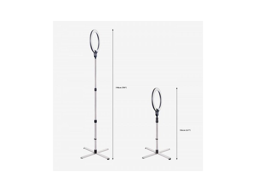 Stojací lampa Daylight Aura Ring Lamp je vyrobena z hliníku a skládá se z několika kusů, které do sebe rychle a snadno zapadají. Lehký materiál, jednoduchost montáže a přepravní taška byly navrženy pro ty, kteří oceňují přenosnost. Tvar kruhu odráží rovnoměrné rozložení světla a bez stínů světla a poskytuje očím pohodlnější pocit. S indexem vykreslení barev (IRC) nad 90+ vyzařuje Daylight Aura Ring světlo, které úzce odpovídá barvám přirozeného světla (IRC 100), což zaručuje přesné vnímání barev a kontrastů. Barevná teplota Daylight Aura Ring je 6000 Kelvinů a vyzařuje neutrální světlo, které je nejblíže přirozenému světlu. Je to ideální teplota pro ty, kteří hledají přesné vnímání barev a kontrastů. Je vybaven podporou pro smartphony a je nepostradatelným nástrojem pro tvůrce digitálního obsahu, jako jsou umělci, ilustrátoři, tetovací umělci, maskéři, youtubeři atd. Hlavní rysy: 4500lx IRC 90+ 6000k Držák na mobilní telefon a USB port Teleskopická podpora Plně variabilní intenzita světla Přesné vykreslení tónu pleti Plochá a stabilní základna Technická charakteristika: Zdroj světla: LED Lumeny: 2100 lm Lux na 30 cm: 4500 Teplota barev: 6 000 ° K. CRI: 90+ Spotřeba energie: 29 W. Barva: stříbrná / černá Nominální životnost LED (hodiny): 50 000 Kontinuální stmívač Výška: 198 cm (78 ") Velikost světla 35,5cm Šířka: 61 cm (24 ″) Hloubka: 57,5 cm (22,6 ") Hmotnost: 2,6 kg (5,7 lb) včetně tašky Délka kabelu: 3,5 m (137,8 ″) Ideální pro: Vizážisté Kadeřnictví Holiči Bloggeři