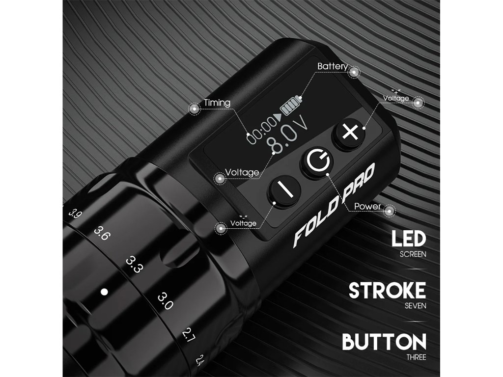 - Nastavitelný zdvih: 2,4/ 2,7/ 3,0/ 3,3/ 3,6/ 3,9/ 4,2 MM – Pro všechny umělce od tetování po SMP.