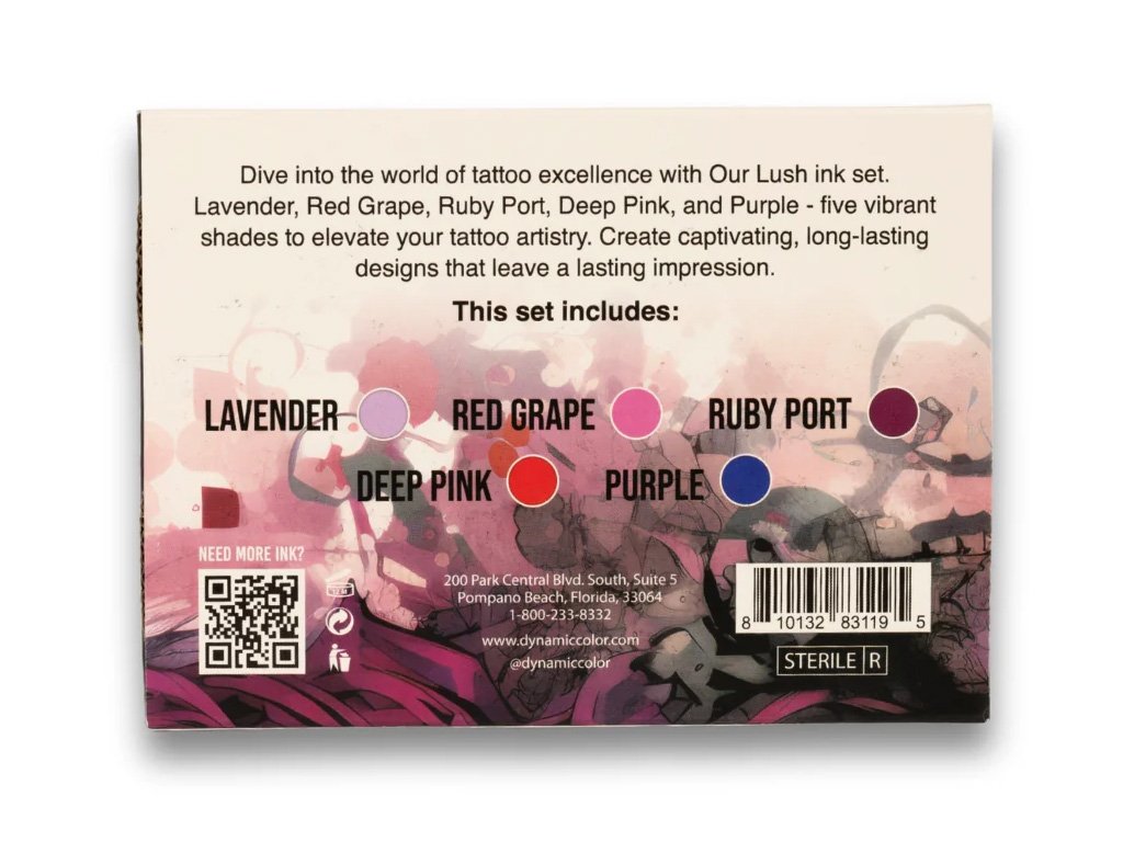 Objevte sílu barev s Dynamic Lush Ink Set, který přináší pět sytých a energických odstínů: Lavender, Red Grape, Ruby Port, Deep Pink a Purple. Tento set je ideální pro umělce, kteří chtějí posunout svou práci na novou úroveň a tvořit dechberoucí barevná tetování, která přetrvají.