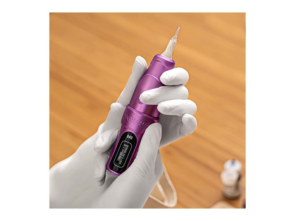 - Životnost baterie: Průměrně 5-6 hodin, až 10 hodin. Životnost baterie závisí na napětí, zdvihu, volbě jehly a typu pokožky.