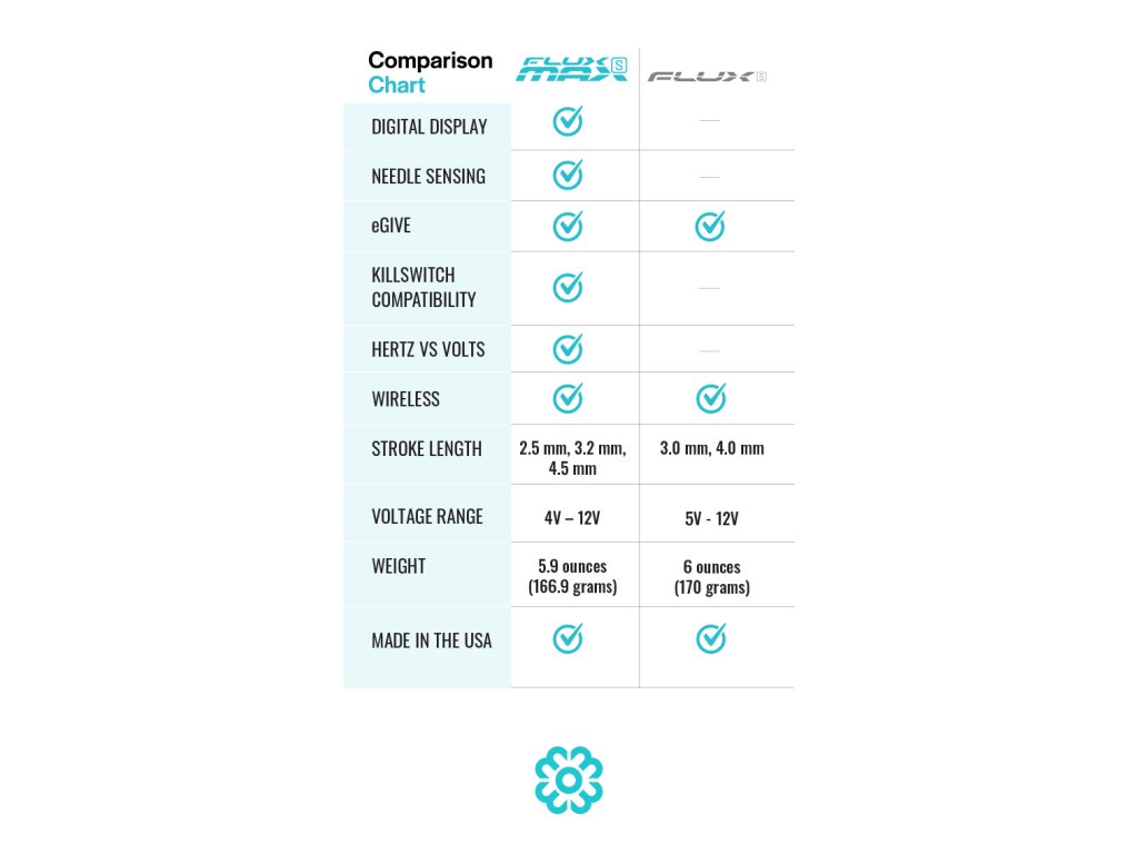 Flux S Max je vybaven novým digitálním displejem, vestavěným menu s akumulátorem PowerBolt Il, který umožňuje dokonalé ovládání všech funkcí a nastavení stroje. PowerBolt II umožňuje umělci snadno procházet možnosti nabídky, zapínat a upravovat Give, číst výdrž baterie a personalizovat zobrazení stroje výběrem Hertz nebo Voltů a 0,1 nebo 0,5 krocích nastavení. Flux S Max je vybaven novou, nejmodernější technologií, která se naučí, jak rádi pracujete, od typu inkoustu, po špičku/jehlu a úroveň tlaku, který aplikujete.