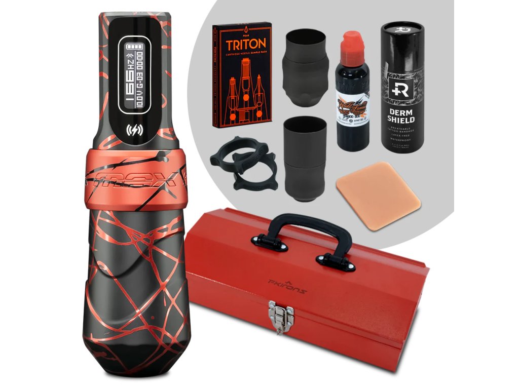 Každý strojek je dodáván v červeném přenosném kufru na nářadí FK Irons s vnitřními přihrádkami na míru pro bezpečné uložení strojku, další baterie a nabíječky a navíc prostor pro vaše zásoby a příslušenství. Každá sada obsahuje různé zásoby od našich přátel a partnerů z oboru, včetně: