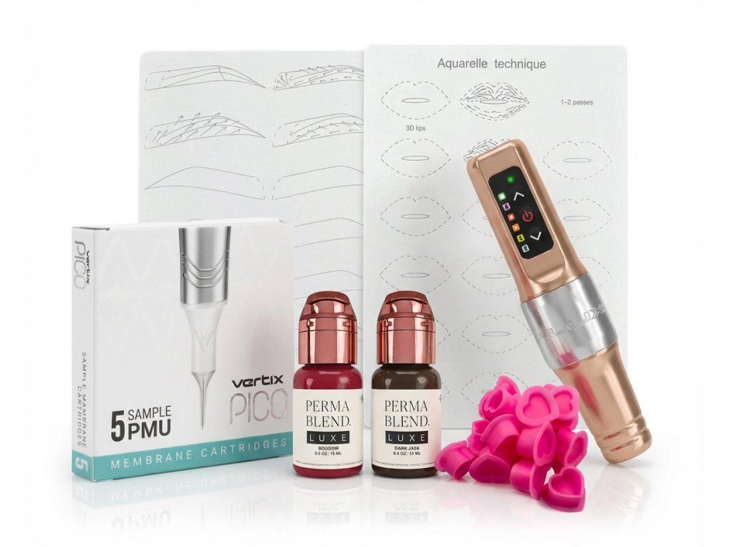 Tato sada je sestavena pro PMU specialisty, kteří vyžadují přesnou kontrolu, stabilní výkon a konzistentní výsledky. Kombinuje ověřené značky a pokrývá celý pracovní cyklus od tréninku techniky až po profesionální aplikaci na klientovi. Obsahuje technologicky vyspělý bezdrátový strojek FLUX Mini se zdvihem 3.0 mm, pigmenty Perma Blend Luxe schválené pro EU REACH, kvalitní PMU cartridgie Vertix PICO, umělé kůže se vzory od Laskin a praktické silikonové kalíšky.