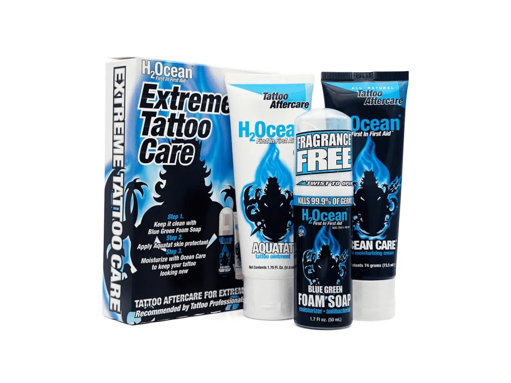 Sada Extreme Hard-to-Heal Tattoo Care Kit nabízí tříkrokový, snadno použitelný a bezpečný proces vhodný pro všechny typy pokožky. Díky farmaceuticky kvalitní masti Healing Aquatat, registrované FDA, antibakteriálnímu přírodnímu hydratačnímu mýdlu Blue Green Foam Soap a hydratačnímu krému Ocean Care Cream vaše tetování zůstane živé a chráněné.