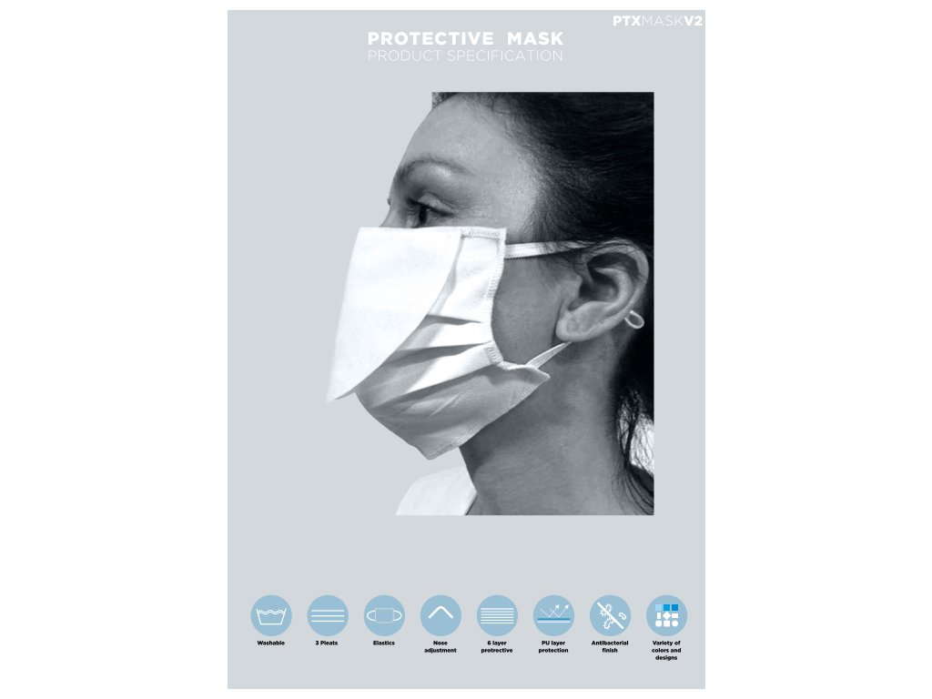 Látková šestivrstvá ochranná rouška PTX MASK V2 s ochranným štítem proti kontaminaci, vyrobeno v Portugalsku 4 vnější vrstvy - PES 100%, 95g/m2 1 vnitřní výplň - PES 100% nečesaná 1 ochranná vrstva 100% PU Vlastnosti: • pratelná ochranná rouška na vícero použití • 3 sklady na obličeji • uchycení pomocí gumičky kolem uší • nastavitelný nosní límec • třívrstvá ochranná vrstva + přední štít pro ochranu před vnější kontaminací • antibakteriální provedení • těsně přilne k obličeji a nezapocuje brýle • prát na 40 stupňů • maska zabraňuje, aby její uživatel zasáhl okolí kapičkami kašle, slin, hlenů a naopak aby nebyl infikován krví pacienta nebo jeho tělními tekutinami • rozměry: 170x90mm, délka gumičky za uši - 180mm