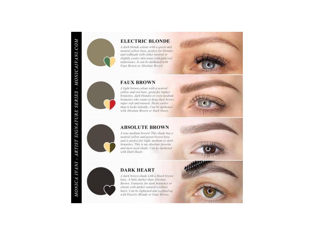 Monica Ivani je mezinárodní trenérka permanentního make-upu a mnoho let získala zkušenosti v PMU a kosmetickém průmyslu. Se svou vlastní řadou formulovala 4 odstíny, které jsou podle ní pro obočí ideální. Díky možnosti smíchat pigmenty nyní umělkyně PMU dokáže pokrýt všechny odstíny obočí potřebné pro různé typy pleti.