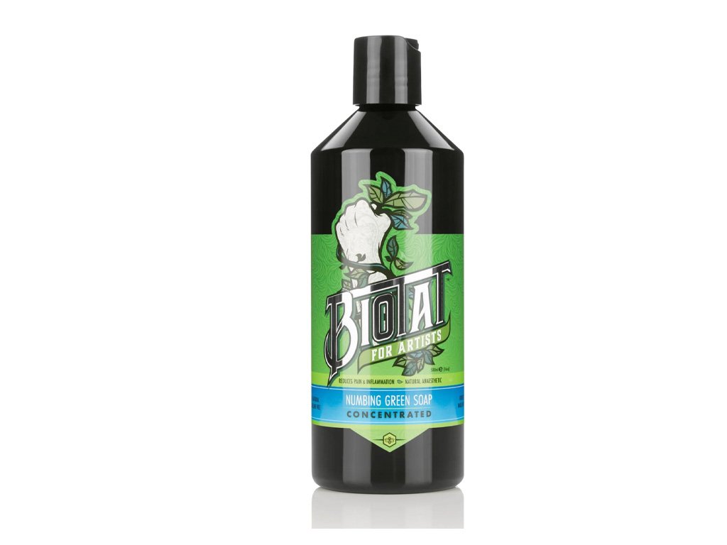 Používejte ho jako každé zelené mýdlo k čištění přebytečného inkoustu při tetování s dalšími výhodami znecitlivění oblasti a dramatického snížení otoku a zarudnutí.