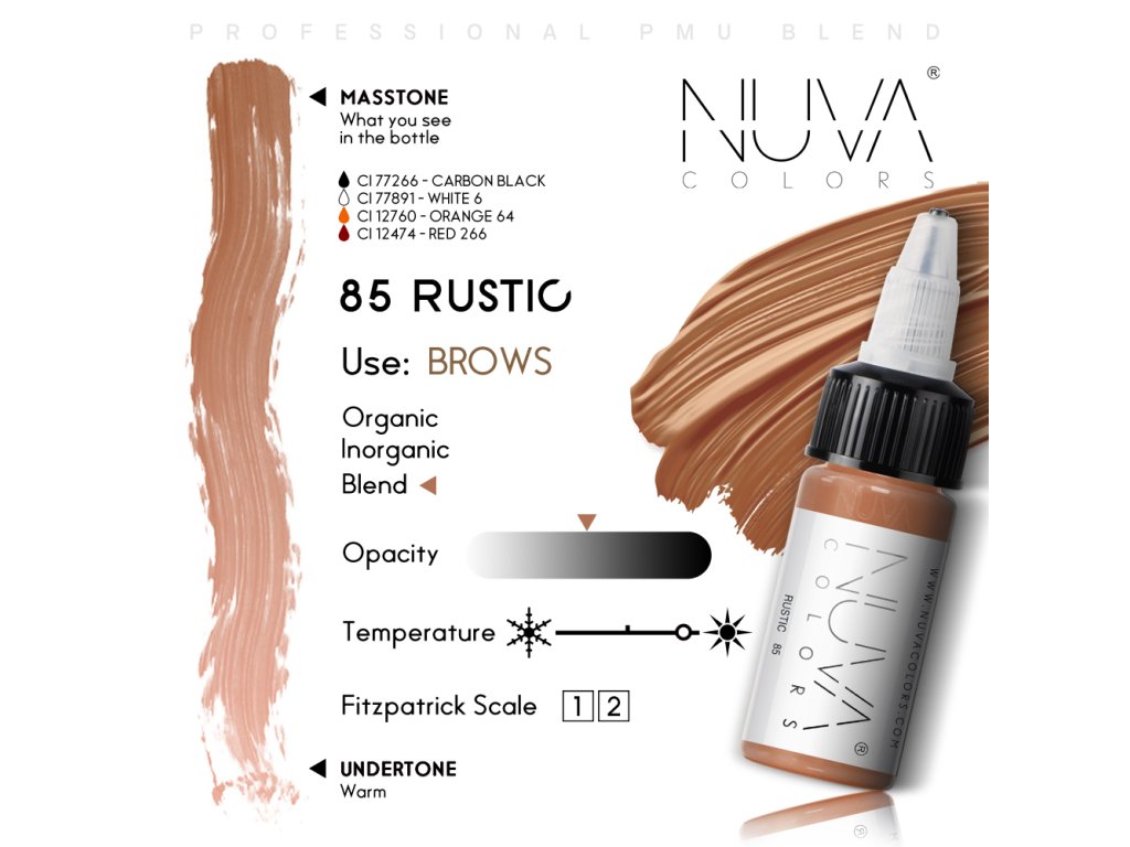 Pigmenty NUVA COLORS poskytují syté a dlouhotrvající efekty. Vyberte si ze šesti sad pigmentů, vybraných speciálně pro různé oblasti pigmentace, včetně rtů, obočí, očních víček, dvorců, jizev a pokožky hlavy. NUVA COLORS zajistí pokaždé hladkou a jednotnou aplikaci.