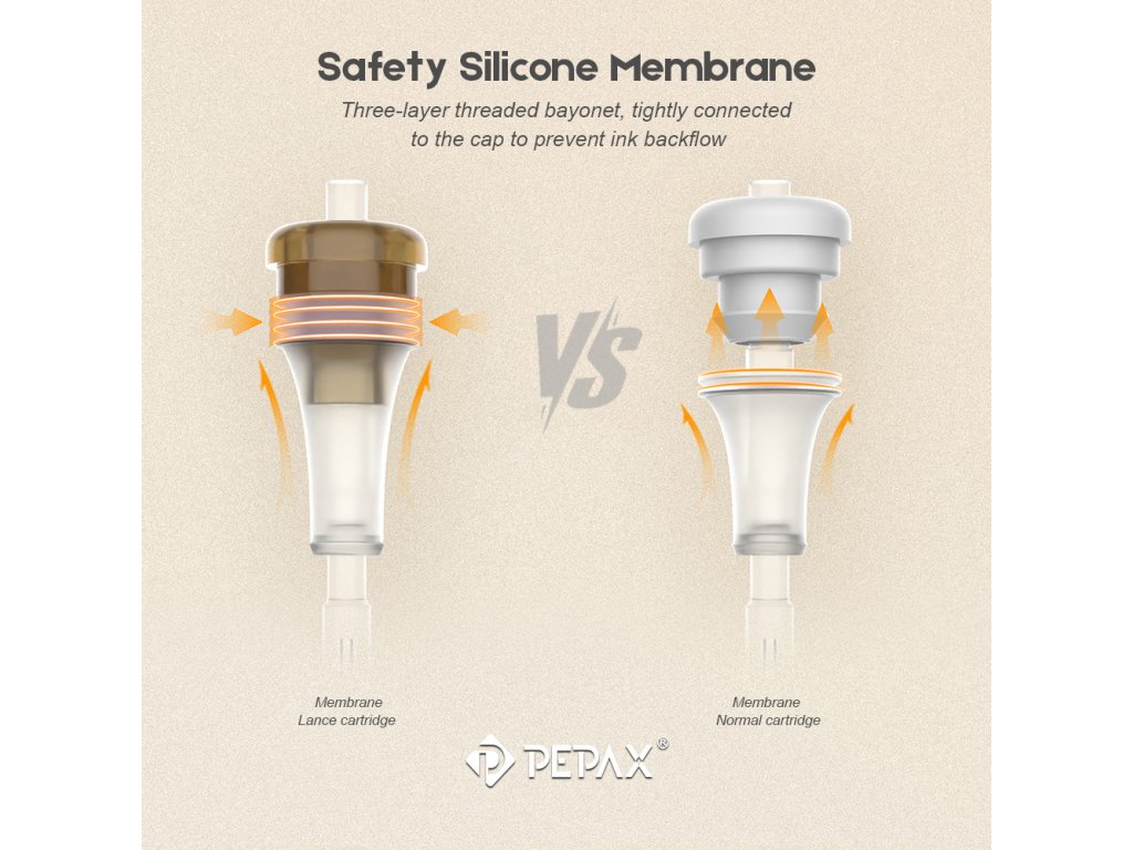 Nové cartridge jehly s bezpečnostní membránou od PEPAX přinášejí vyšší úroveň bezpečnosti a výkonu. Plastový obal je vyroben z lékařského PC materiálu, který nabízí větší bezpečnost než běžně používaný PVC. Jehly jsou vyrobeny z japonské nerezavějící oceli, s ručním ostřením a precizním uložením pro optimální kvalitu a výkon.