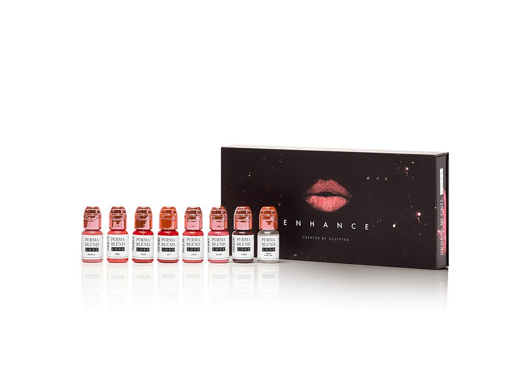 Perma Blend Luxe Enhance Set obsahuje 8 pigmentů pro permanentní make-up, které jsou v souladu s nejnovějšími předpisy REACH. Sada obsahuje sedm základních barev - včetně tmavého zemitého odstínu Haze, který dobře funguje jako modifikátor – plus ředidlo Adjust pro úpravy.