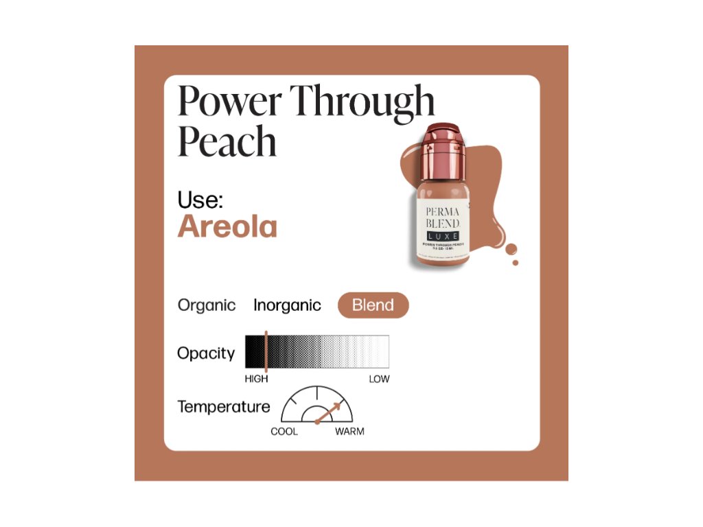 Power Through Peach - Světlý, tlumený růžový tělový tón s vysokou krycí schopností, který poskytuje silný základ pro světle až středně růžový dvorec. Doporučeno pro barvení bradavek.