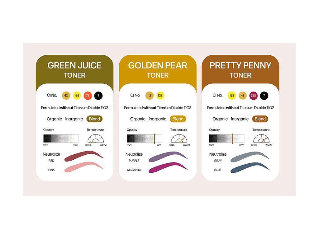 Potřebujete upravit obočí? Jednoduchá teorie barev je přesně to, co lékař nařídil. Green Juice, Pretty Penny a Golden Pear pomáhají neutralizovat obočí, které se postupně změní do oranžové, červené, zelené, modré nebo fialové. Tyto tonery jsou vyrobeny bez oxidu titaničitého.