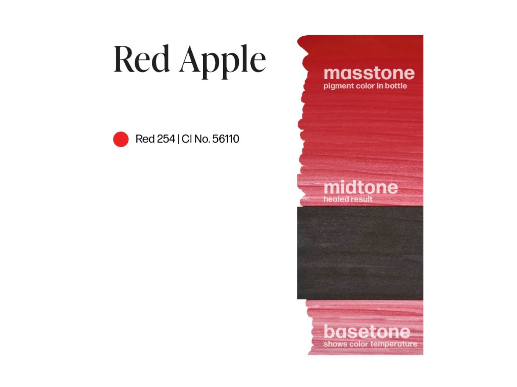 Ohromující průhledná středně červená s lehkým spodním proudem růžovo-červené. Vzhledem k čistým vlastnostem červeného jablka přispěje přirozená barva rtů klienta ke konečné zahojené barvě.