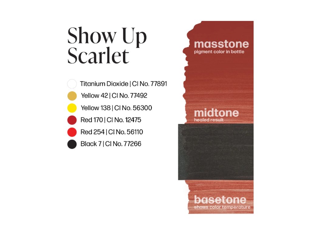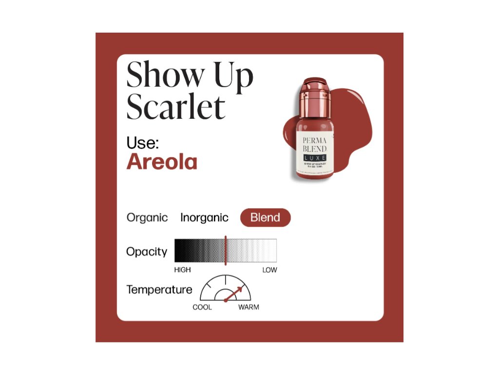 Show Up Scarlet - Teplý růžový odstín se silnou neprůhledností pro nejlepší prolnutí a stínování pro ty růžovější odstíny dvorce. Doporučeno pro barvení bradavek.