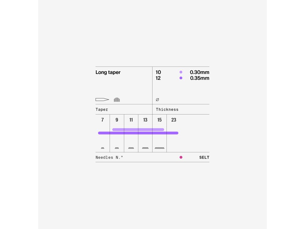 Hroty jsou pečlivě vyrobeny s ultratenkým profilem, který účinně minimalizuje tření o kůži a zároveň maximalizuje viditelnost a citlivost při průniku jehly. Tento inovativní design zajišťuje hladší a přesnější tetování pro umělce i klienta.