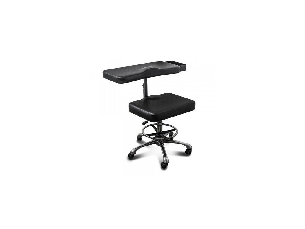Velká loketní opěrka je umístěna centrálně před sedadlem, čímž vytváří pohodlnou pracovní desku, na které si klient a tetovač pohodlně odpočinou během práce. Loketní opěrka má hlubokou polici pro veškeré příslušenství pro tetování, takže je vždy po ruce.