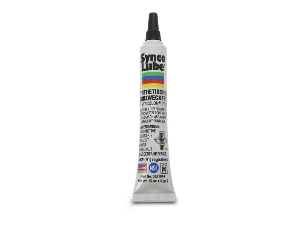 Synco Lube® syntetické víceúčelové mazivo se Syncolon® (PTFE) je patentované vysoce výkonné syntetické víceúčelové mazivo. Syntetické základní kapaliny a přídavek mikročástic Syncolon® (PTFE) tvoří prémiové mazivo pro prevenci tření, koroze a rzi, což prodlužuje životnost strojů a zařízení. Výrazně se snižuje opotřebení a zvyšuje se produktivita. Syntetické mazivo s obsahem Syncolon® (PTFE) je potravinářské mazivo registrované NSF, klasifikované jako H1, pro náhodný kontakt s potravinami. Navíc je šetrný k životnímu prostředí a také biologicky odbouratelný. Vlastnosti: Obsah: 12 g nevodivá látka (dielektrikum) Syntetické vysoce výkonné a víceúčelové mazivo Bezpečné pro potraviny Nekape, neteče ani se nevypařuje Nepropustný pro kapaliny Odolný Zabraňuje rzi a korozi Snižuje opotřebení Teplotní rozsah: -43°C až 232°C Kompatibilní s jinými mazivy Přátelský k životnímu prostředí Biologicky odbouratelný NLGI GC-LB schváleno pouze pro třídu 2 Registrováno NSF (H1 pro náhodný kontakt s potravinami) Typické aplikace: Kluzná, válečková, kuličková, jehlová a kolová ložiska. Vačky, šoupátka, ventily, dopravníky, řetězy Mazání O-kroužkem Zařízení na zpracování potravin Dielektrické aplikace, ochrana baterie Domácnost Volný čas Sportovní Průmysl