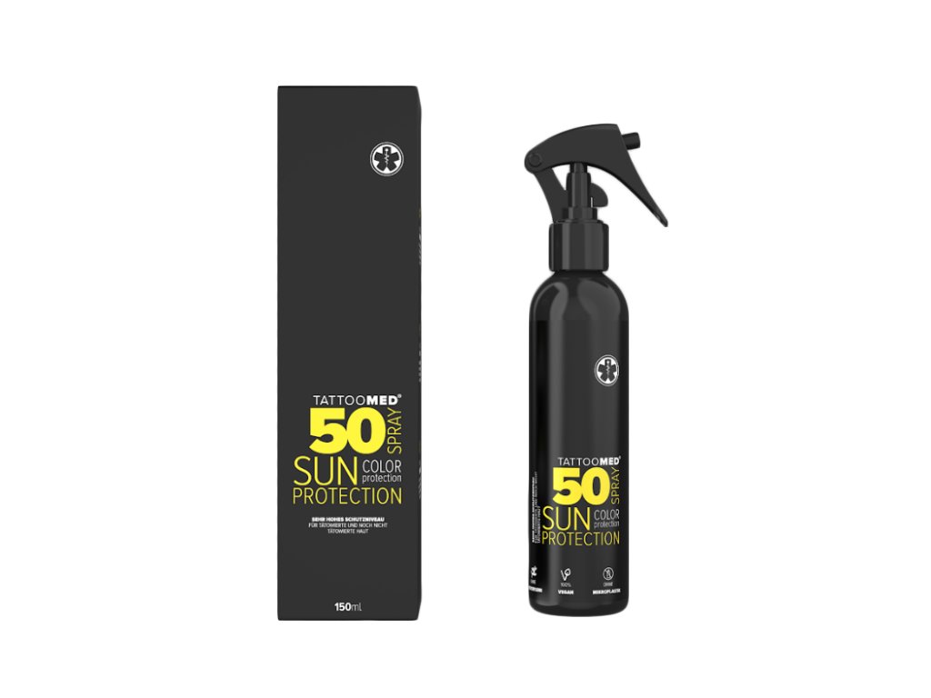 TattooMed SPF50 Sun Spray zaručuje okamžitou a účinnou ochranu proti UVA/UVB paprskům pro tetovanou pokožku.