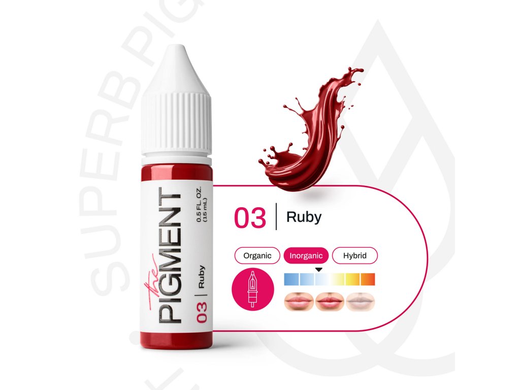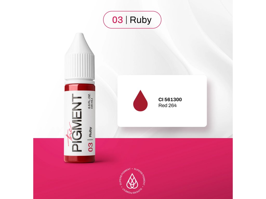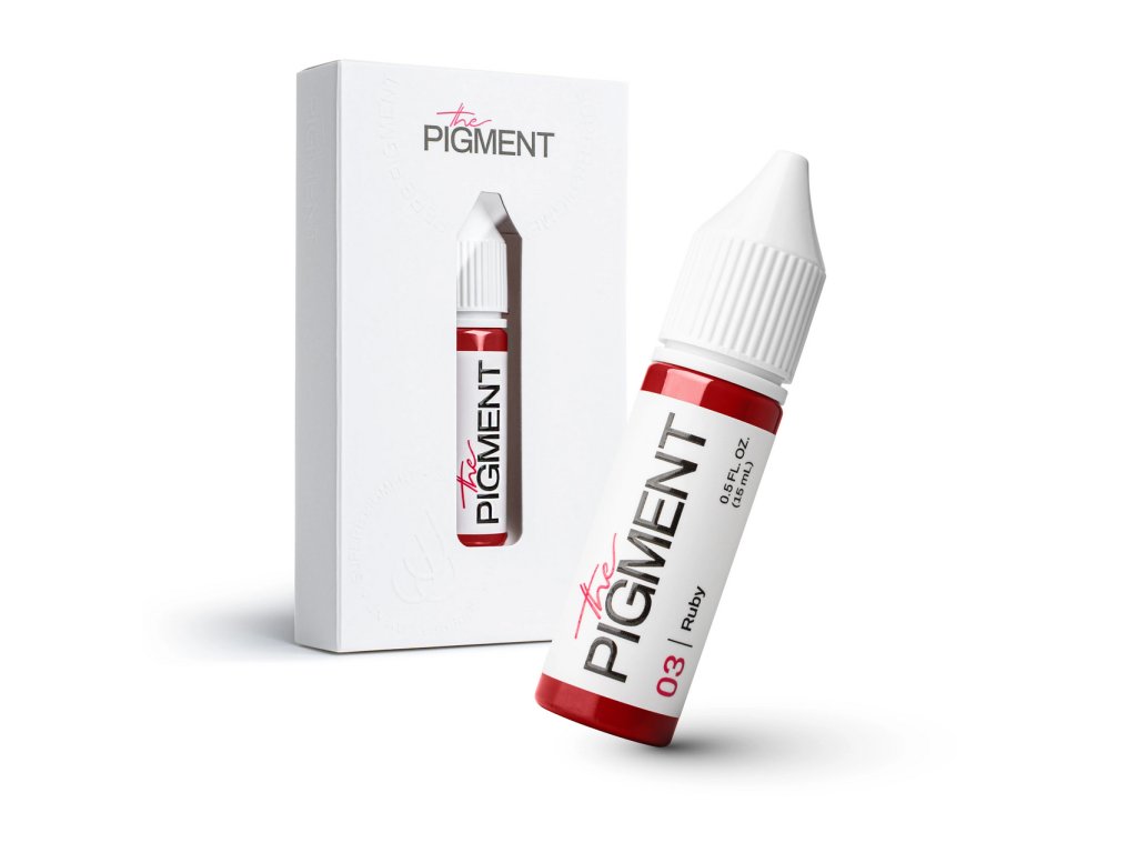 Pigment The Pigment 03 Rubínová nabízí sytý, čistě červený odstín, který působí luxusně a přitom přirozeně. Díky neutrálně studenému základu vytváří vyvážený efekt vhodný pro klientky, které preferují silnější, ale harmonicky působící barvu rtů. Pigment má střední až vysoké krytí a hedvábně živý finiš, který rtům dodává hloubku, výraz a eleganci.