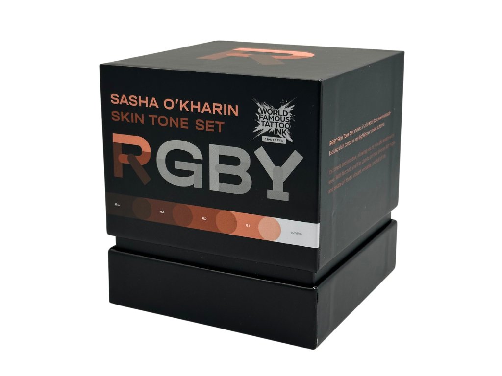Sada Sasha O'Kharin RGBY byla navržena jako komplexní kolekce inkoustů pro tóny pleti s širokou škálou podtónů, stejně jako ty, které Sasha používá ve své vlastní práci. Každý tetovací inkoust je seskupen podle svého podtónu do červených, zelených, modrých a žlutých mini sad, což vám umožní vytvořit rozmanitou škálu odstínů lidské kůže pro tetování s neuvěřitelnou barevnou realitou.
