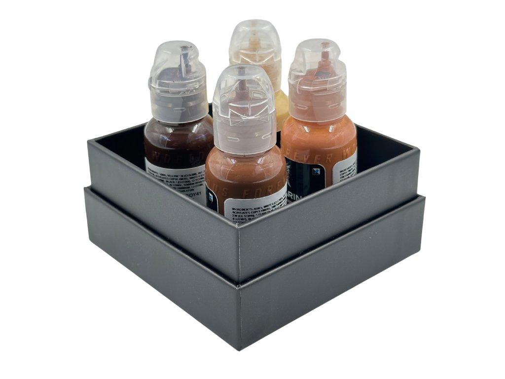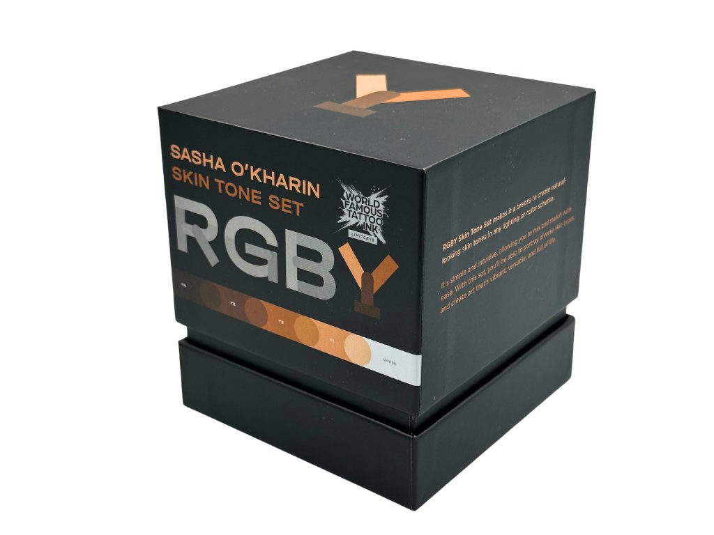 Sada Sasha O'Kharin RGBY byla navržena jako komplexní kolekce inkoustů pro tóny pleti s širokou škálou podtónů, stejně jako ty, které Sasha používá ve své vlastní práci. Každý tetovací inkoust je seskupen podle svého podtónu do červených, zelených, modrých a žlutých mini sad, což vám umožní vytvořit rozmanitou škálu odstínů lidské kůže pro tetování s neuvěřitelnou barevnou realitou.