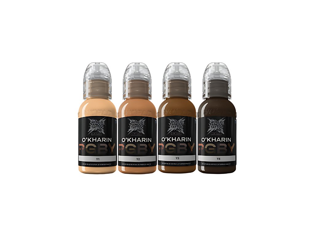 World Famous Limitless Sasha O'Kharin RGBY Yellow Set je formulace sady, která je šetrná k EU REACH a kterou navrhl člen World Famous Ink Pro-Team Sasha O'Kharin a obsahuje následující tetovací inkousty: